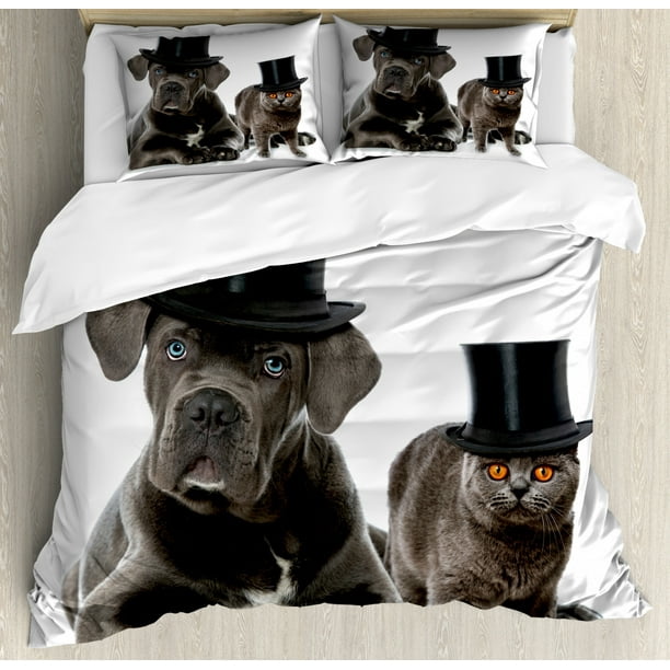 Dog And Cat Duvet Cover Set King Size Cane Corso And A Kitten In Cylinder Magician Hats Decorative 3 Piece Bedding Set With 2 Pillow Shams Charcoal Grey Cinnamon Sea Blue Dimgray